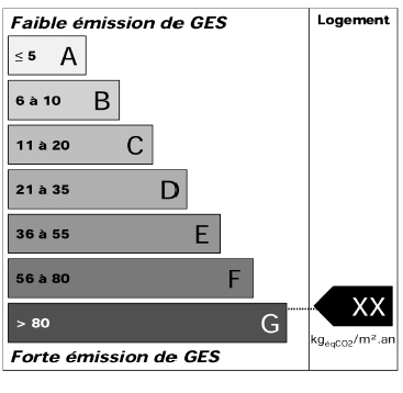 Pour les bâtiments à usage principal d'habitation, le classement de la quantité totale d'émissions de gaz à effet de serre se fait dans une échelle de sept classes, appelée « étiquette climat ». La quantité d'émissions est croissante, partant de la classe A (la plus performante, figurant en mauve clair), à la classe G (la moins performante, figurant en mauve foncé).