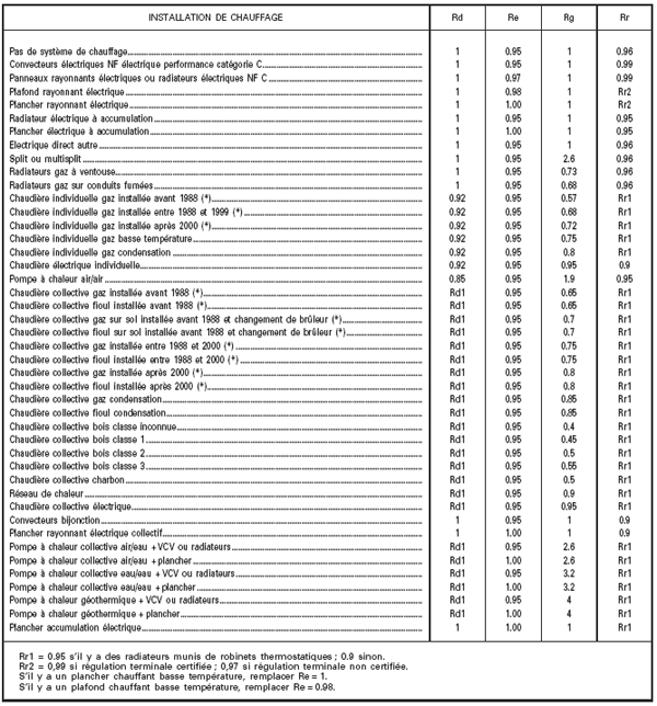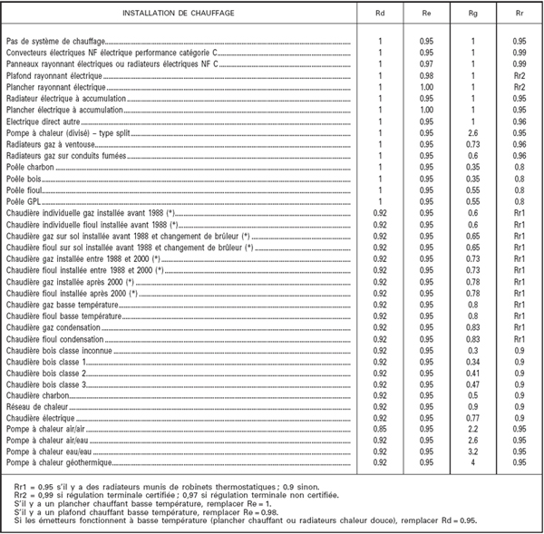 Les consommations de chauffage sont calculées à partir des besoins de chauffage et par application de rendements de distribution et de génération. Les rendements d'émission peuvent être pris en compte soit par un rendement, soit par une variation de température (dans ce dernier cas, l'impact est pris en compte dans les besoins).