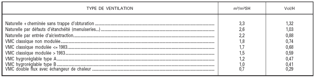 - le débit de renouvellement d'air évalué en fonction du mode de ventilation du bâtiment (naturelle, ventilation mécanique contrôlée) et du niveau d'étanchéité à l'air des locaux ;