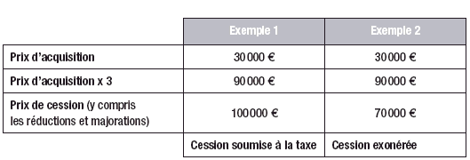 Exemple 2 - Exonération de taxe forfaitaire en fonction du prix de cession et du prix d'acquisition