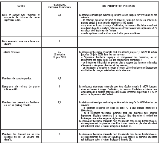 Lorsque des travaux d'installation ou de remplacement de l'isolation thermique sont entrepris sur une paroi, ceux-ci doivent être réalisés de telle sorte que la paroi isolée doit avoir une résistance thermique totale, définie dans l'annexe III au présent arrêté, exprimée en mètres carrés. Kelvin par Watt (m².K/W), supérieure ou égale à la valeur minimale donnée dans le tableau suivant en fonction du type de paroi concernée.