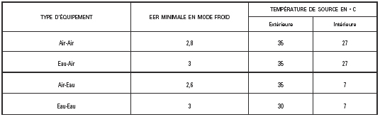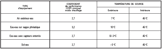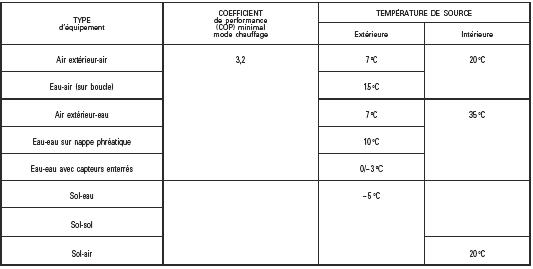 Les pompes à chaleur utilisant l'électricité à destination de chauffage, installées ou remplacées, doivent satisfaire à un coefficient de performance (COP), au sens de la norme NF EN 14-511, supérieur ou égal à la valeur donnée dans le tableau suivant, pour les températures indiquées :