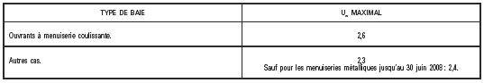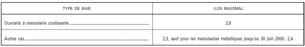 Lorsque le rôle de la fermeture est pris en compte, l'exigence de l'article 7 s'exprime donc en Ujn plutôt qu'en Uw. Le coefficient Ujn, exprimé en watt par mètre carré.kelvin (W/m².K), doit donc être inférieur ou égal à la valeur donnée dans le tableau suivant :