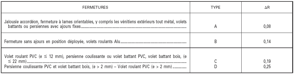 Avec R la résistance thermique additionnelle, en m².K/W, apportée par la fermeture.