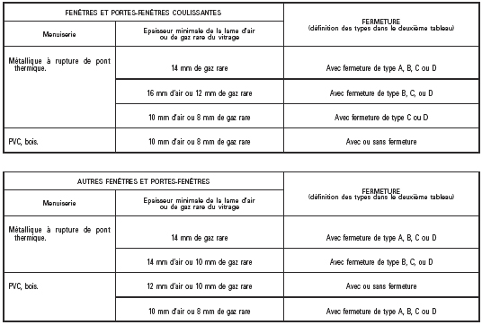 A défaut de valeurs connues des performances des fenêtres et des fermetures, les configurations décrites dans les tableaux suivants sont réputées satisfaire aux exigences de l'article 9. Les vitrages décrits sont tous des double-vitrages peu émissifs à isolation renforcée (VIR).