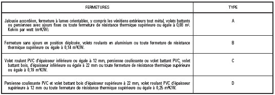 Lorsque la fenêtre, la porte-fenêtre ou la façade-rideau est munie d'une fermeture, cette exigence peut être satisfaite en prenant en compte la résistance thermique additionnelle de la fermeture, de sorte que le coefficient Ujn respecte les conditions données en annexe IV.