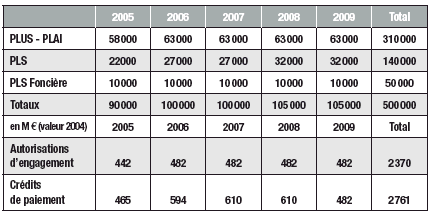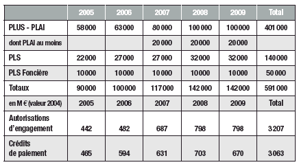 Les engagements supplémentaires portent exclusivement sur la production des PLUS et PLAI : leur nombre est augmenté de 17 000 en 2007 et de 37 000 en 2008 ainsi qu'en 2009. Le nombre de PLAI est désormais spécifié et porté à 20 000 pour chacune de ces trois années, soit 12 000 de plus qu'en 2006. Sur la période 2007-2009, les autorisations d'engagement progressent en conséquence de 837 M e et les crédits de paiement de 302 M e.