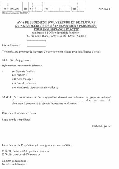 L'avis de jugement d'ouverture et de clôture de la procédure de rétablissement personnel pour insuffisance d'actif est adressé par le greffe du juge de l'exécution au Bulletin officiel des annonces civiles et commerciales, conformément à l'annexe I.