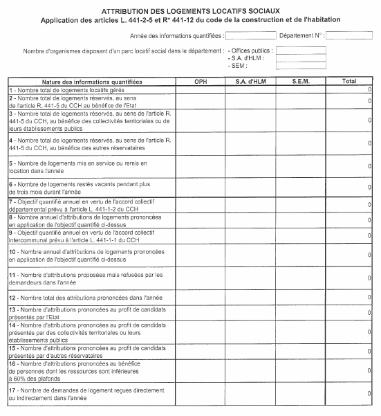 Les organismes d'habitations à loyer modéré et les sociétés d'économie mixte gérant des logements locatifs sociaux adressent au préfet du département d'implantation desdits logements, avant le 1er mars de chaque année, les informations suivantes arrêtées au 31 décembre de chaque année :