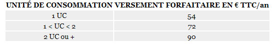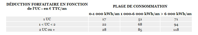La déduction forfaitaire mentionnée à l'article 2 du présent décret est égale, pour chaque plage de consommation considérée et pour chaque unité de consommation (UC), aux valeurs suivantes :