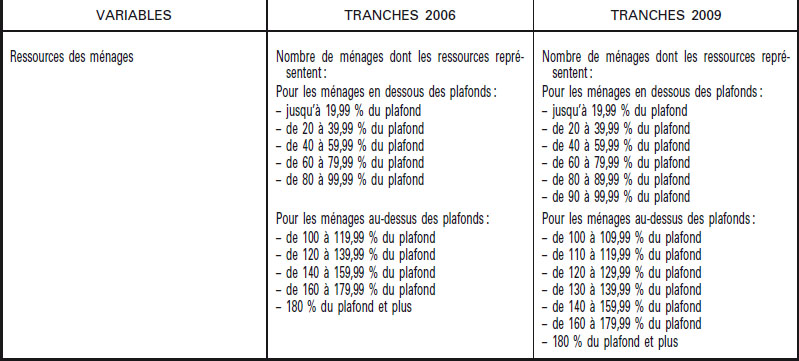 Eclatement de la question 13 en deux questions (variable « Ressources des ménages ») : les questions 13 et 13 bis. Le tableau de la question 13 concerne l'ensemble des ménages occupant un logement social dont l'accès est soumis à un plafond inférieur ou égal au plafond PLUS. On y comparera les revenus de ces ménages avec le plafond PLUS de référence (7). Le tableau de la question 13 bis concerne l'ensemble des ménages occupant un logement social dont l'accès est soit soumis à un plafond strictement supérieur au PLUS, soit n'est soumis à aucun plafond de ressources. On y comparera les revenus de ces ménages avec le plafond PLUS de référence.
