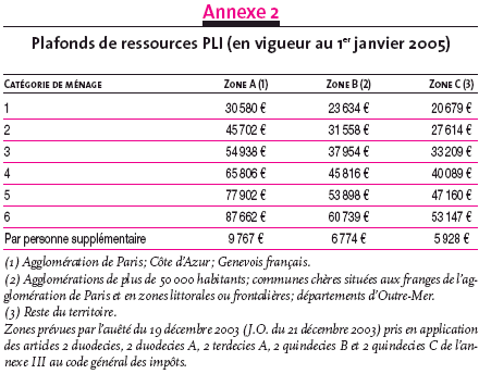 Plafonds de ressources PLI (en vigueur au 1er janvier 2005)