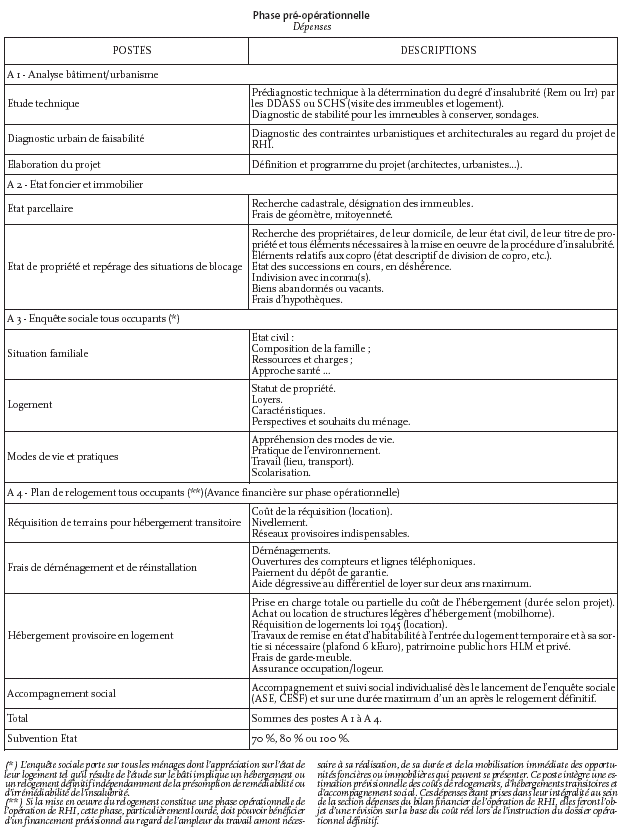 Il correspond à la réalisation des études pré-opérationnelles et la mise en oeuvre, partielle ou totale, du plan de relogement préalablement à la prise des arrêtés d'insalubrité, en application des articles du code de la santé publique modifiés par la loi SRU.