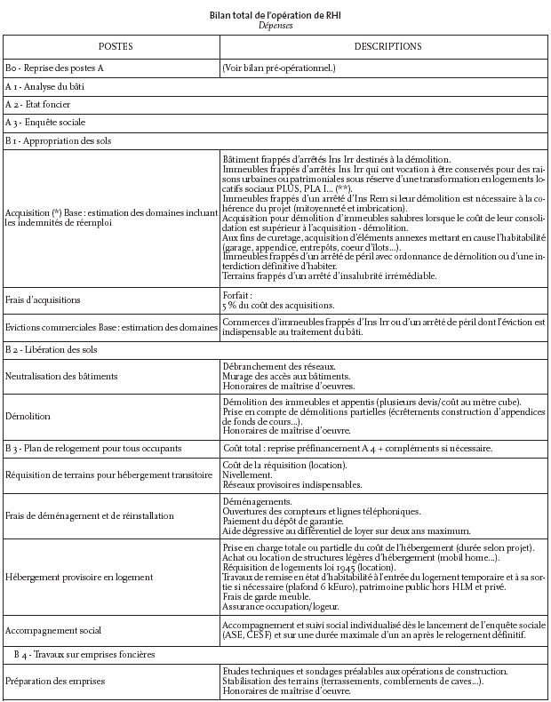 La nature des postes "recettes" et "dépenses" exprimées HT et TTC qui peuvent être pris en compte dans le bilan d'une opération de RHI est précisée ci-après.