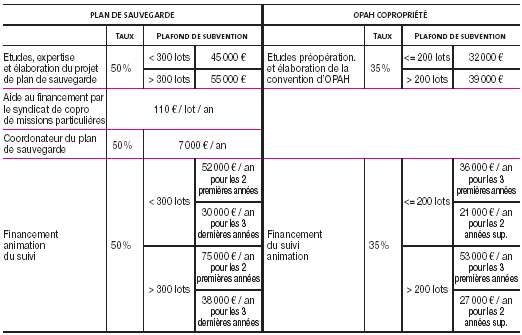 L'attention est attirée sur le fait que pour les copropriétés situées en périmètre d'OPAH copropriété ou celles faisant l'objet d'un volet spécifique d'une OPAH classique, les taux et montants des subventions sont minorés par rapport à ceux des plans de sauvegarde, les difficultés à traiter étant de moindre ampleur.