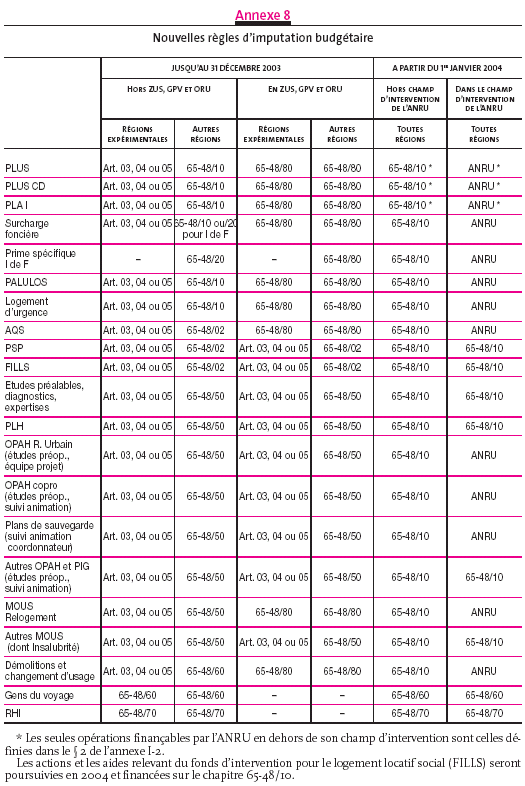 Les opérations qui sont situées dans le champ d'intervention de l'ANRU relèvent désormais du financement de l'ANRU et non plus des crédits budgétaires classiques ; leurs modalités de financement seront définies par voie réglementaire et par des instructions ultérieures de l'ANRU.