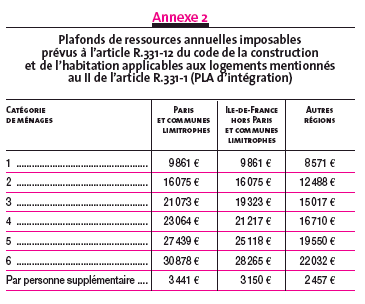 TABLEAU Plafonds de ressources annuelles imposables prévus à l'article R.331-12 du code de la construction et de l'habitation applicables aux logements mentionnés au II de l'article R.331-1 (PLA d'intégration)