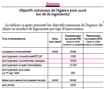Première année de mise en œuvre du Plan de Cohésion Sociale, 2005 aura permis d'obtenir des résultats très encourageants. Les objectifs de l'année 2006 sont en augmentation, avec 35000 logements à loyers maîtrisés, 16000 remises sur le marché de logements vacants, et le traitement de 13000 logements indignes.
