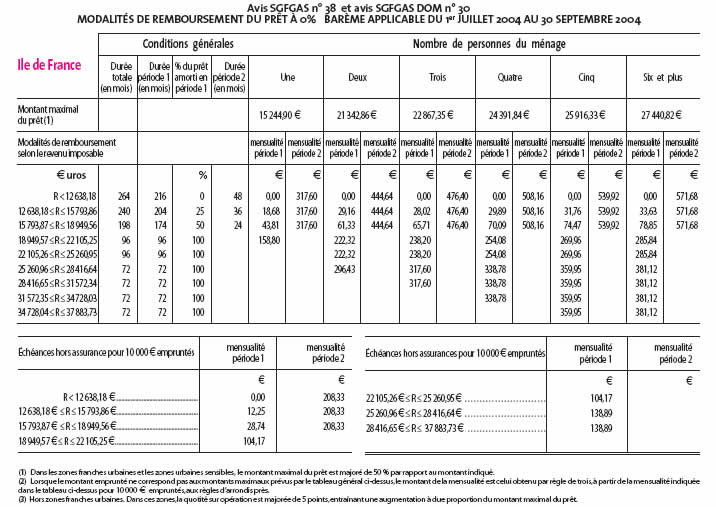 Les modalités de remboursement du prêt à taux zéro font l'objet chaque trimestre d'un avis de la Société de Gestion du Fonds de garantie de l'accession sociale à la propriété (SGFGAS). Les avis du SGFGAS publiés ci-après donnent les barèmes applicables du 1er juillet au 30 septembre 2004. Rappelons que la date de référence est celle de l'offre de prêt émise par l'organisme prêteur.
